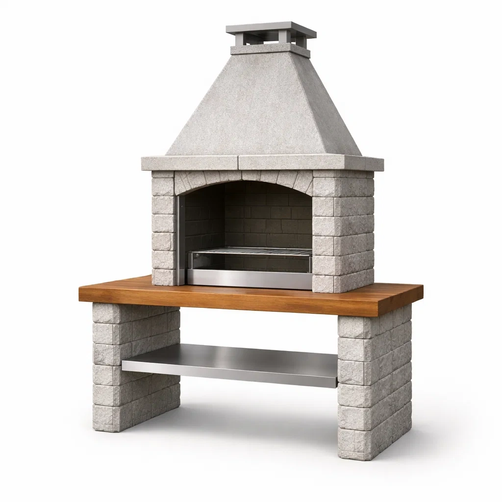 Ce barbecue est construit en pierre réfractaire, offrant une excellente résistance à la chaleur. Le plan de travail est en bois traité et il est complété par une étagère en métal inoxydable. Ses dimensions sont de 180 cm de longueur, 70 cm de largeur, et 220 cm de hauteur. Le poids total de l'unité est de 350 kg. La couleur principale est une combinaison de gris et de tons bois. Inclus avec le barbecue, une grille de cuisson et une étagère en métal sont fournis.