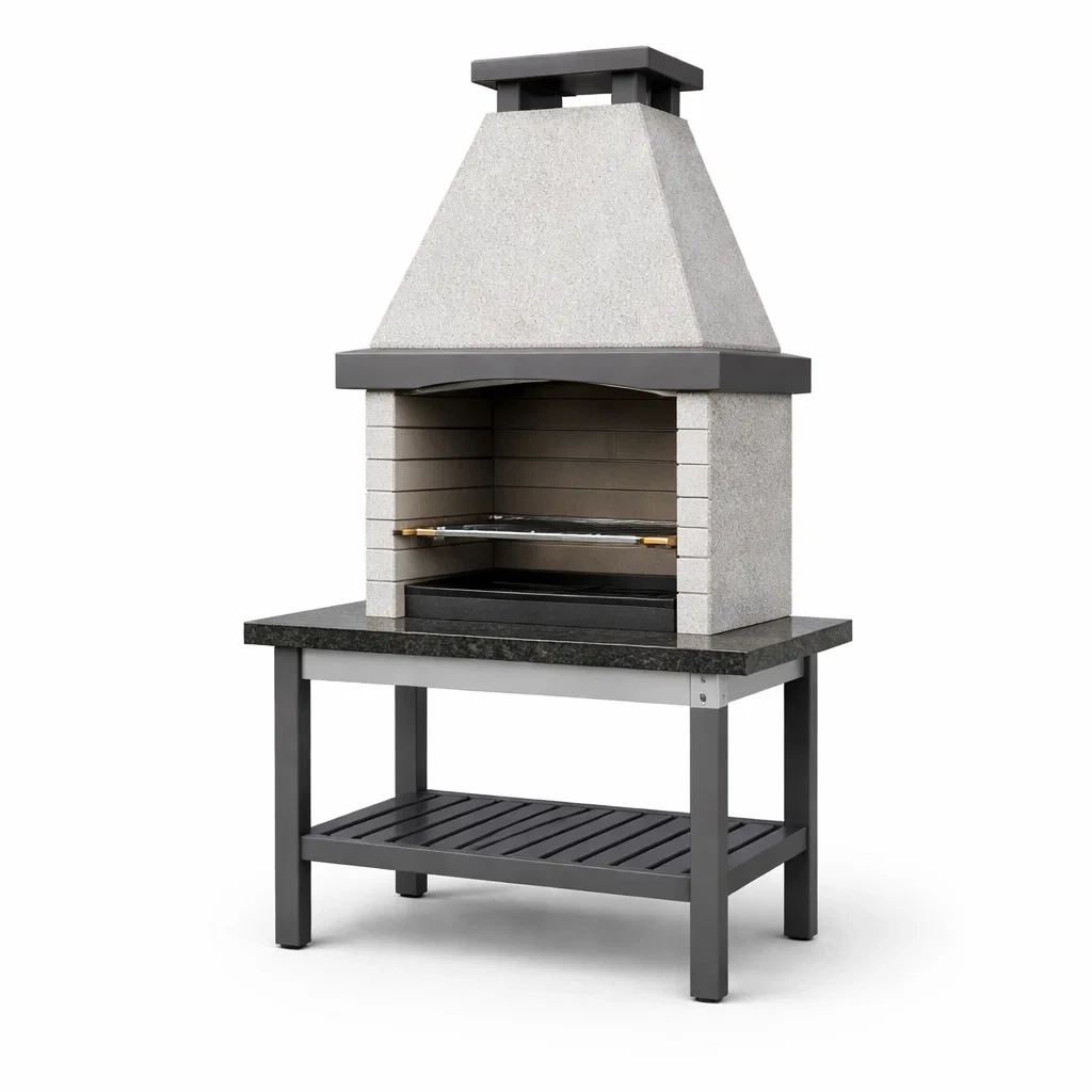 Ce barbecue d'extérieur est fabriqué en béton réfractaire avec un plateau en granite. Ses dimensions sont de 135 cm de longueur, 65 cm de largeur et 140 cm de hauteur. Il pèse 200 kg et est de couleur Gris.