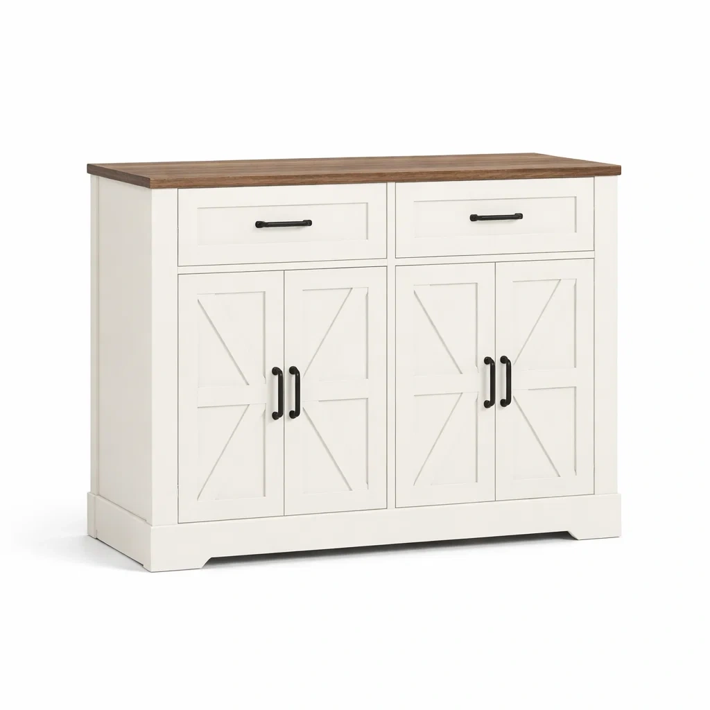Ce buffet en bois présente un dessus en chêne massif et un cadre en MDF. Il comprend deux tiroirs et quatre portes pour un espace de rangement généreux.