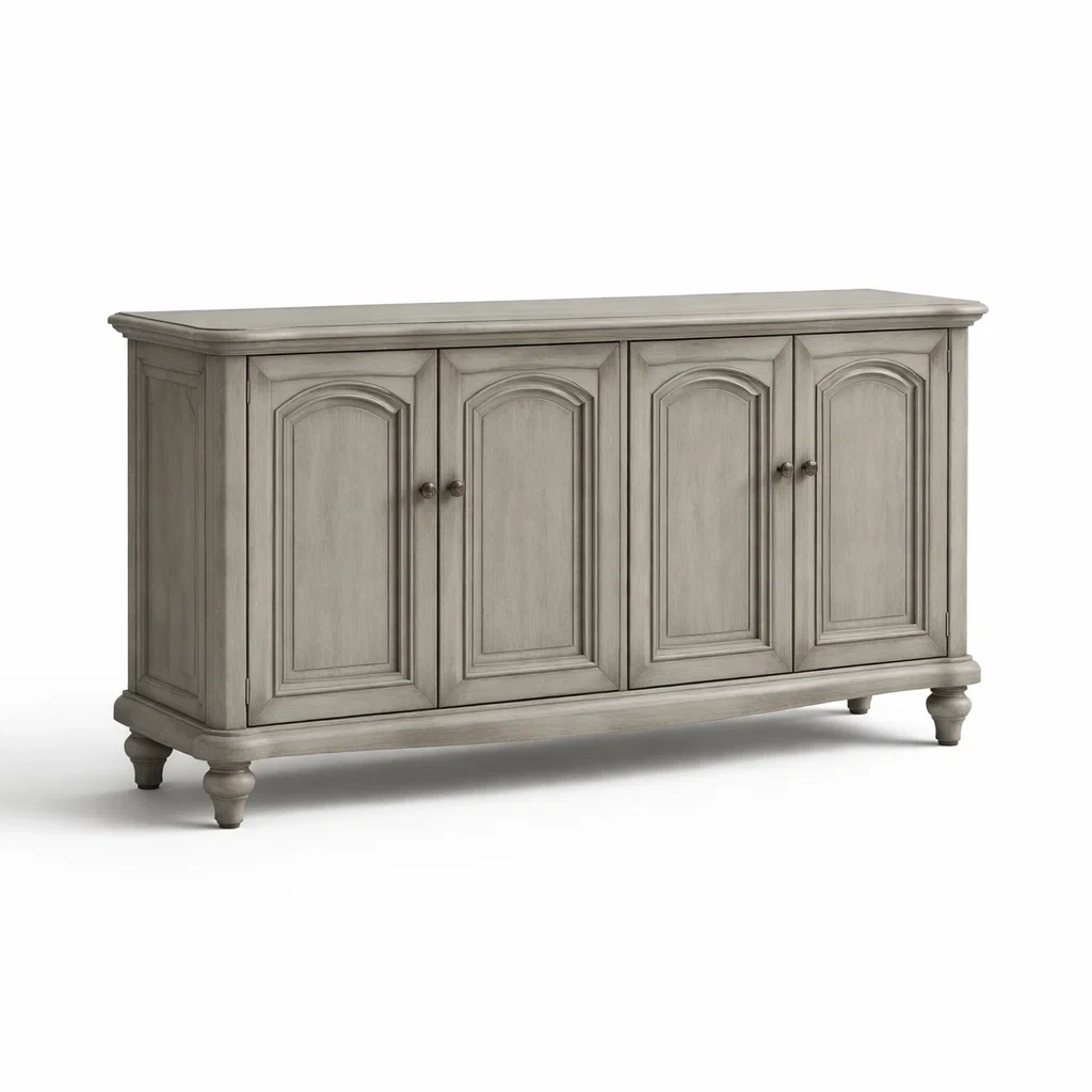 Buffet avec structure en bois massif, finition en peinture grise. Les dimensions du meuble sont 180 cm de longueur, 45 cm de largeur, et 90 cm de hauteur. Conçu pour le rangement.